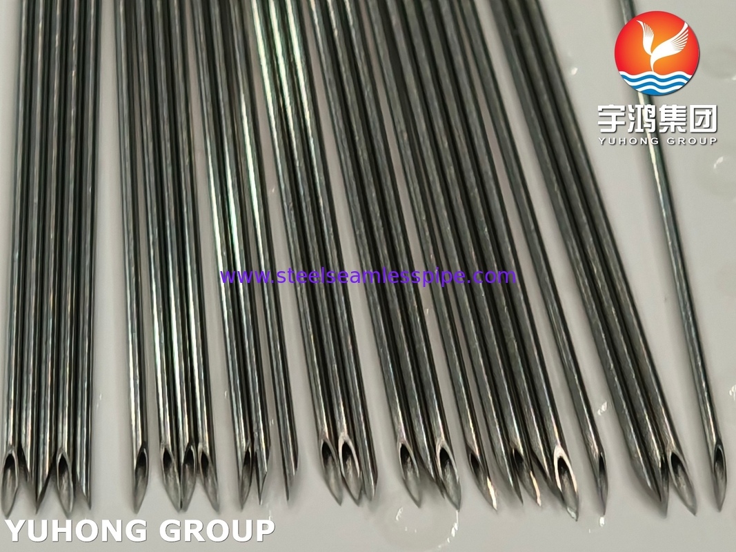 Roestvrijstalen Naaldbuis is een buis met een kleine boring, koudgetrokken naaldbuis die is gemaakt van 304 of 316L roestvrij staal vanwege hun uitstekende corrosiebestendigheid, sterkte en biocompatibiliteit. Deze naaldbuis wordt veel gebruikt in de medische apparatuur, lucht- en ruimtevaart, automobielindustrie, sieraden, voedselverwerkende industrieën enzovoort. Het is ook populair bij modelbouwers. De naaldbuizen worden geproduceerd uit roestvrijstalen strips. Roestvrijstalen strips worden verwerkt door laserthermische fusie lassen tot capillaire buizen, en deze buizen worden verwerkt door de diameter & dikte te verminderen, te gloeien, te reinigen, recht te maken en te snijden. Vervolgens worden buizen geslepen tot naaldbuizen met verschillende naaldpunten. Dit proces houdt nauwe toleranties aan op OD en ID. Het wordt vaak aangeduid als Naaldbuis. SUS304 en SUS316L naaldbuizen, conform de ISO9626-standaard, garanderen veiligheid, precisie en betrouwbaarheid bij medische injecties.